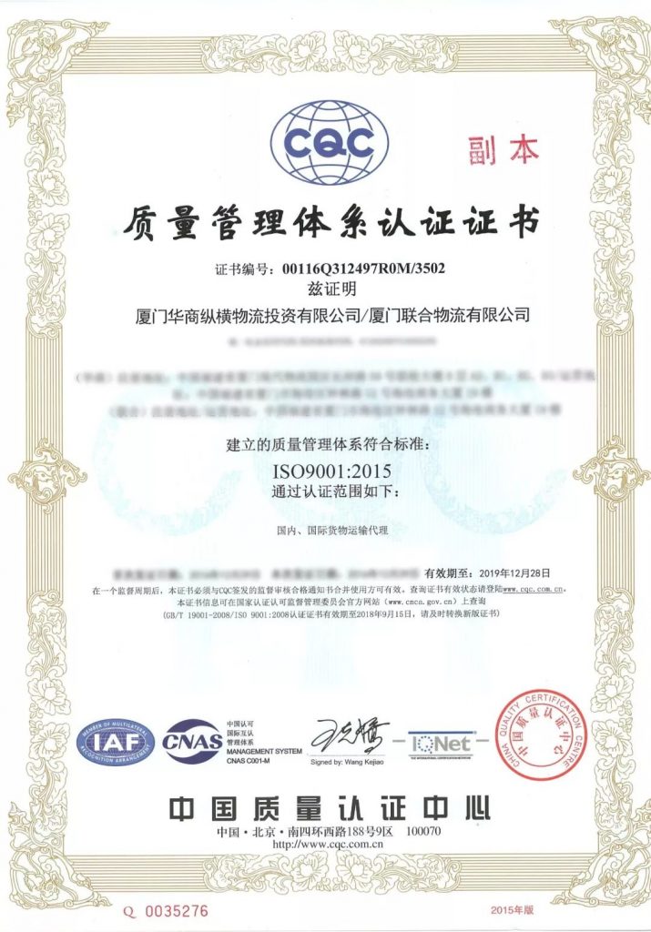 On December 5, 2018, the Xiamen Branch of Globelink China Logistics welcomed China Quality Certification Center (CQC) audit team leader Yu Fengzhen and team member Shen Liying in the ISO9001 annual audit stage. With the active cooperation of various departments, we finally passed the CQC certification audit.