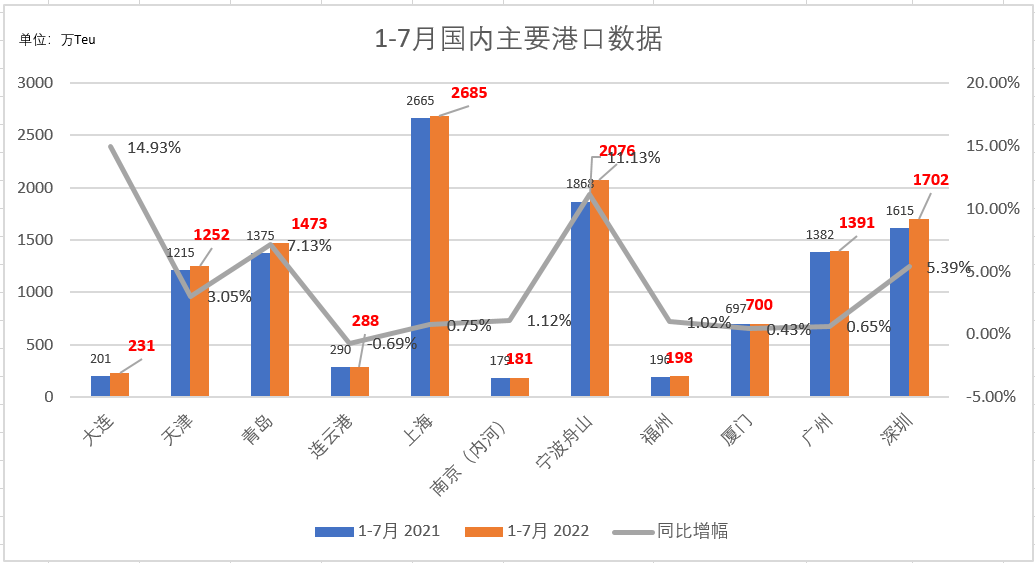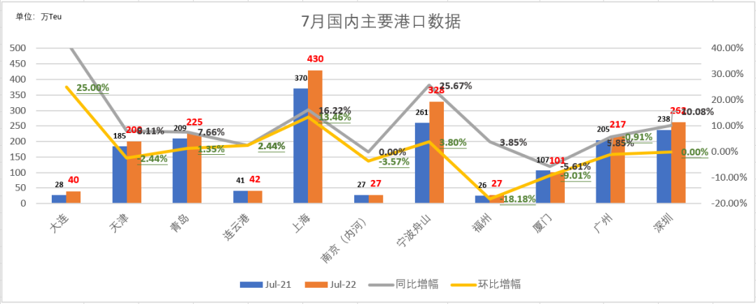 As shown in the data of the China's Ministry of Transport, the total throughput of domestic ports in July was 26.36 million TEUs, growing 2.05% MoM compared to June and 11.18% YoY compared to the same month last year; the total volume completed from January to July was 168.68 million TEUs, up 4.19% YoY. As the epidemic stabilized around the country, the government introduced a series of relevant policies, focusing on stabilizing the supply chain of the industry chain to help enterprises secure orders, markets and confidence, so export figures have returned to the level before the epidemic. The highlights are as follows:
