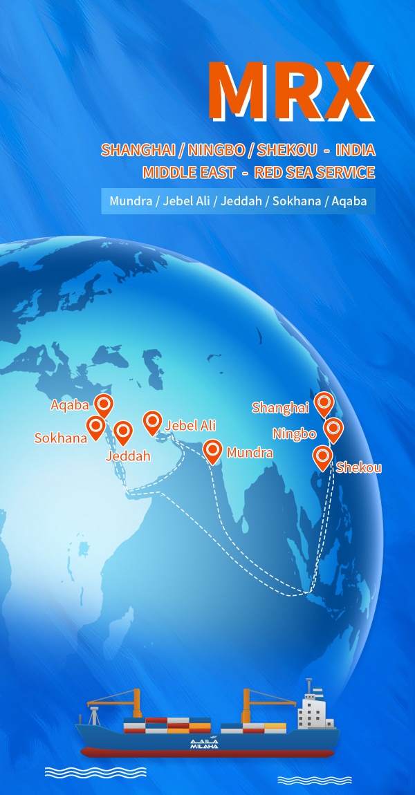 為進(jìn)一步強化一帶一路沿線區(qū)域的航線網(wǎng)絡(luò)布局,MILAHA航運再次邁出戰(zhàn)略性步伐,宣布即將開通新的印度-中東-紅海航線服務(wù)——MRX [MILAHA RED SEA EXPRESS] 航線。該航線于12月28日從MUMDRA(蒙德拉港)啟航,提供周班船服務(wù),并增設(shè)JEDDAH(吉達(dá))到AQABA(亞喀巴)與SOKHANA(蘇科納港)的支線服務(wù),多點覆蓋紅海地區(qū),為沿線國家提供更加便捷、高效的物流服務(wù)。