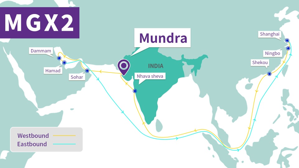 - MRX航線串聯(lián)印度、中東及紅海地區(qū)的干線與支線港口;包括印度西部MUMDRA、阿聯(lián)酋JEBEL ALI、沙特阿拉伯JEDDAH、埃及SOKHANA和約旦AQABA等重要支線港口。
